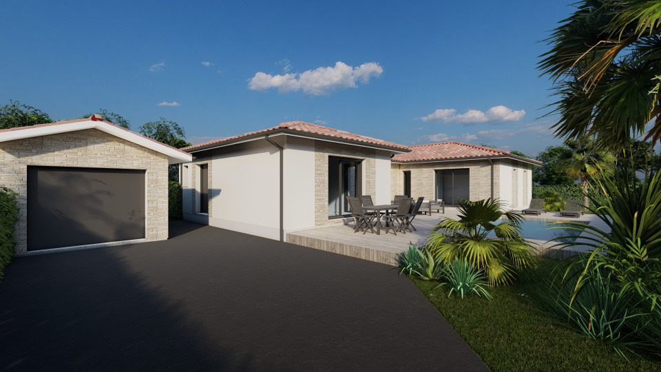Conçue de plain-pied, elle inclut trois chambres, une cuisine et deux salles de bains. De style moderne et en forme de U avec son garage indépendant.